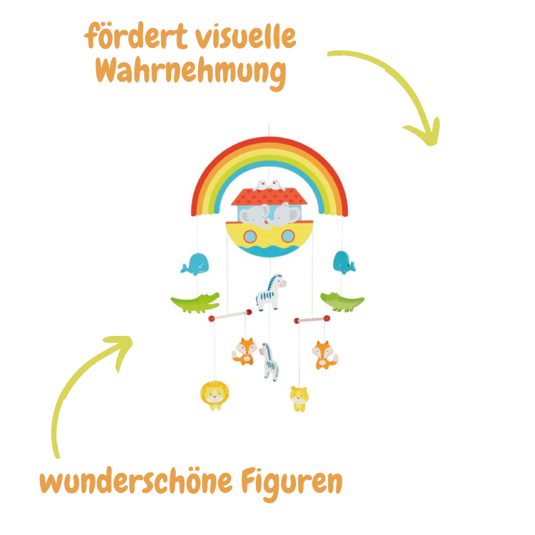 - Visuelle Stimulation: Die einfachen und liebevoll gestalteten Figuren des Mobiles sind ein wahrer Hingucker und regen die visuelle Wahrnehmung deines Babys an. Es wird fasziniert sein von den lebendigen Farben und Formen.