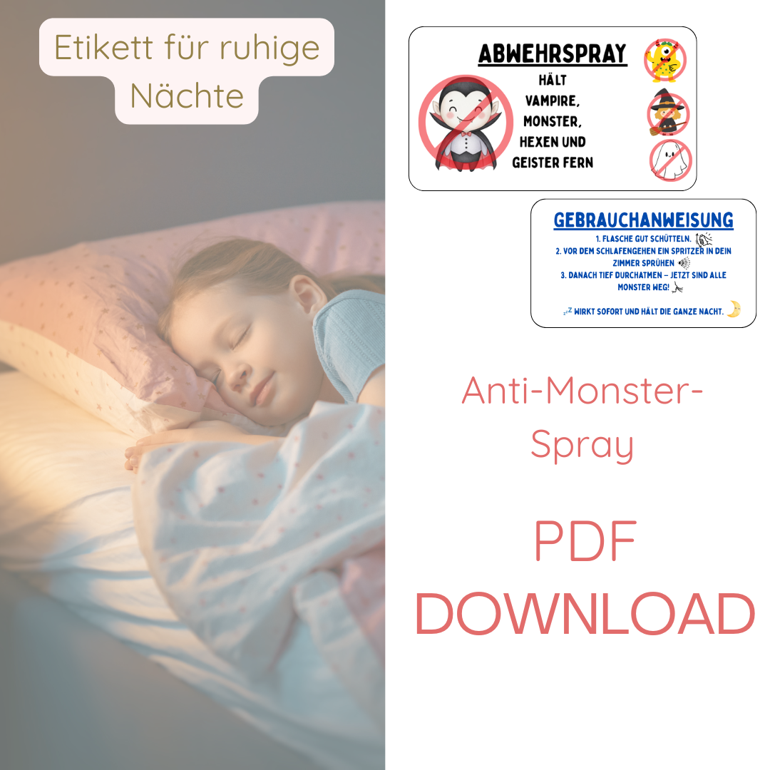 Mit unserem PDF-Ausdruck für Anti-Monster-Spray verwandelt sich jede gewöhnliche Sprühflasche in ein echtes Zaubermittel! Kinder erhalten ein bunt gestaltetes Etikett zum Aufkleben sowie eine kindgerechte Gebrauchsanweisung, die garantiert für Sicherheit und süße Träume sorgt.