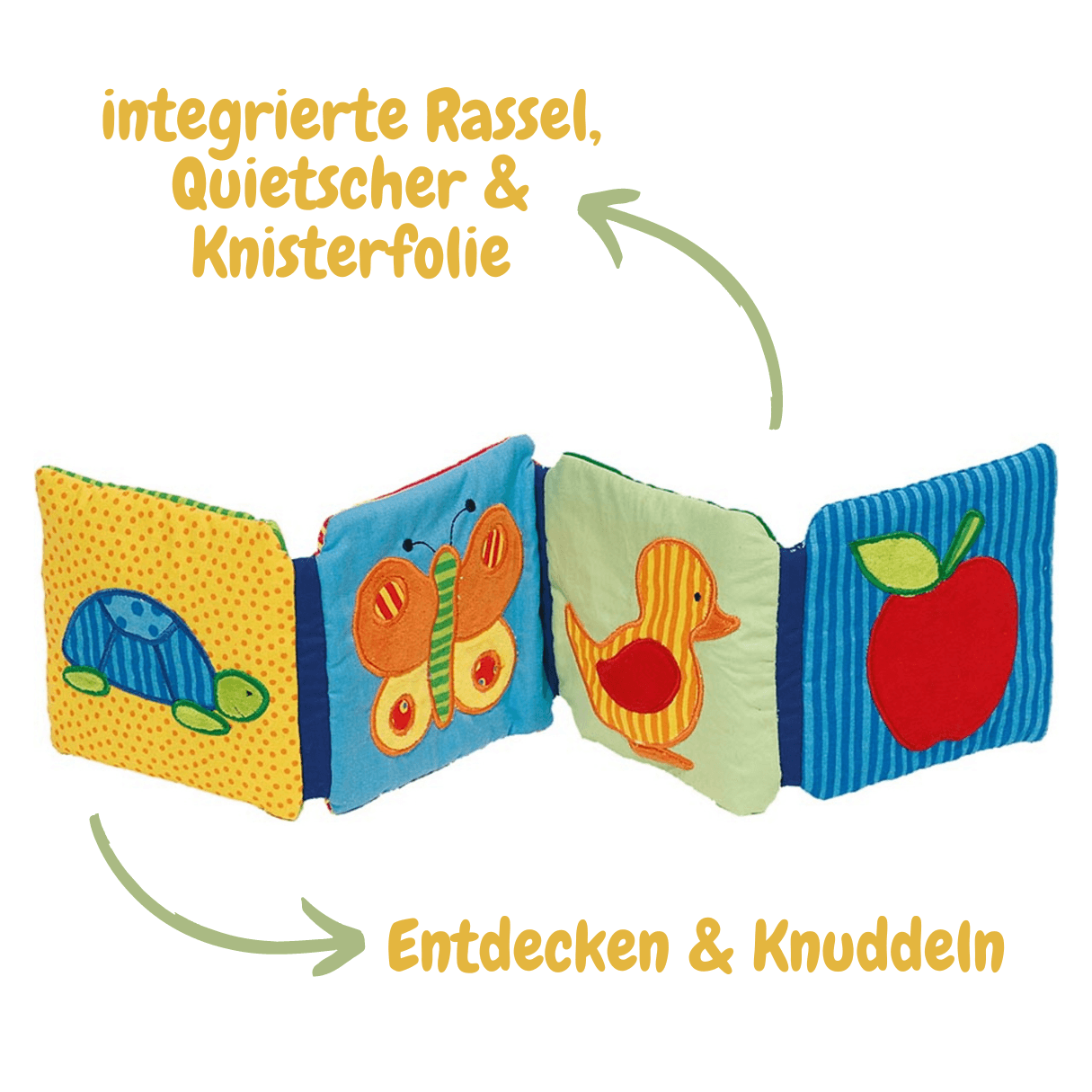 buntes Bilderbuch mit Rassel, Quietscher und Knisterfolie von Goki