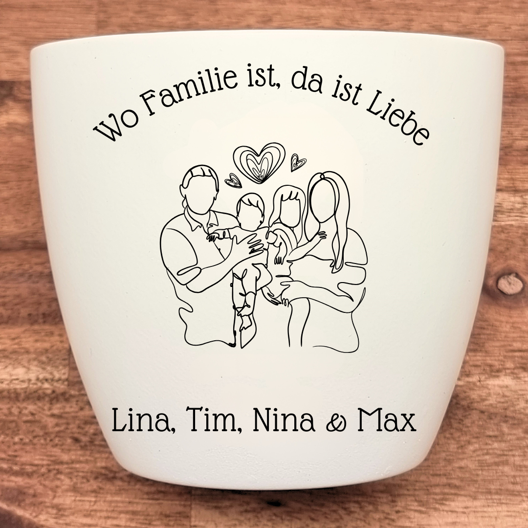 Zum Topf: Egal, wie weit man geht – Familie ist der Ort, an dem Liebe immer bleibt und Wurzeln schlägt. 👨‍👩‍👧‍👦 Dieser gravierte Blumentopf ist das perfekte Geschenk, das die besondere Bindung innerhalb der Familie feiert. Mit einer individuellen Gravur wird der Topf zu einem wundervollen Erinnerungsstück, das die Kraft der Liebe und die Stärke der Familie widerspiegelt.