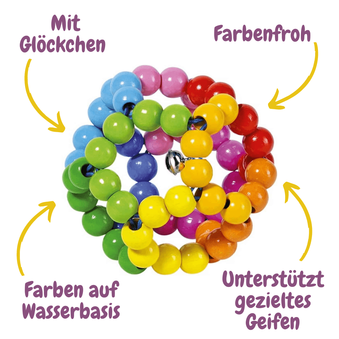 Der Greifling aus Holz ist ein ideales Spielzeug für kleine Entdecker. Er unterstützt die Entwicklung des gezielten Greifens, regt die Phantasie an und ist dabei sicher und unbedenklich. Mit seinen Regenbogenfarben und den kleinen Glöckchen bietet er deinem Baby stundenlangen Spielspaß. Vertraue auf die hochwertige Verarbeitung und die unbedenklichen Materialien dieses Spielzeugs und beobachte, wie dein Baby seine motorischen Fähigkeiten weiterentwickelt.