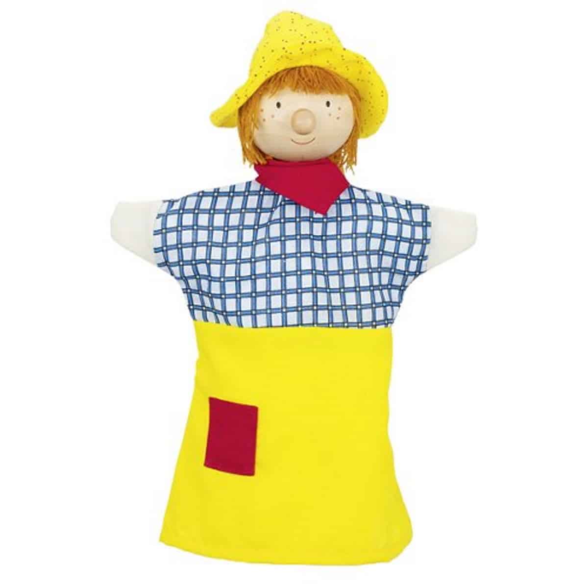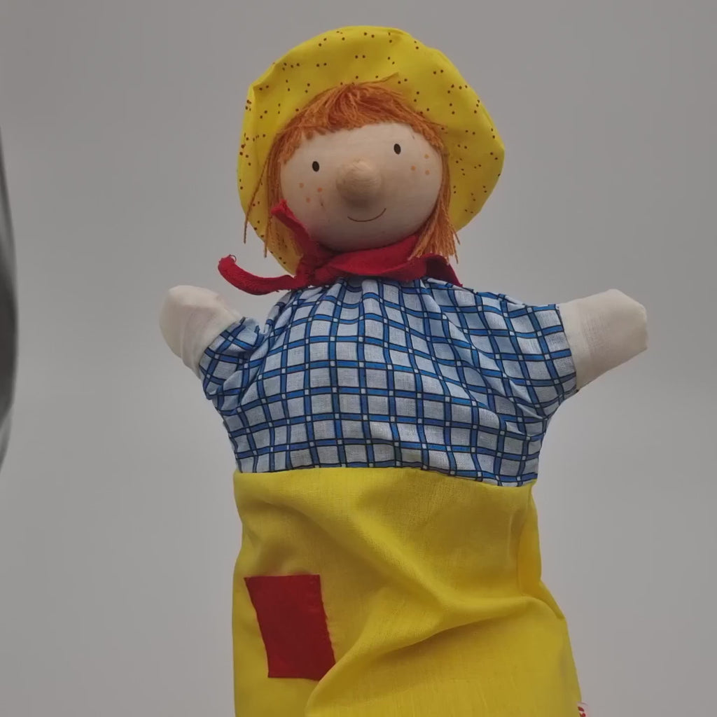 Aus Holz und Textil, jede Handpuppe wird in einer extra Faltschachtel geliefert. Ideal zum Verschenken.