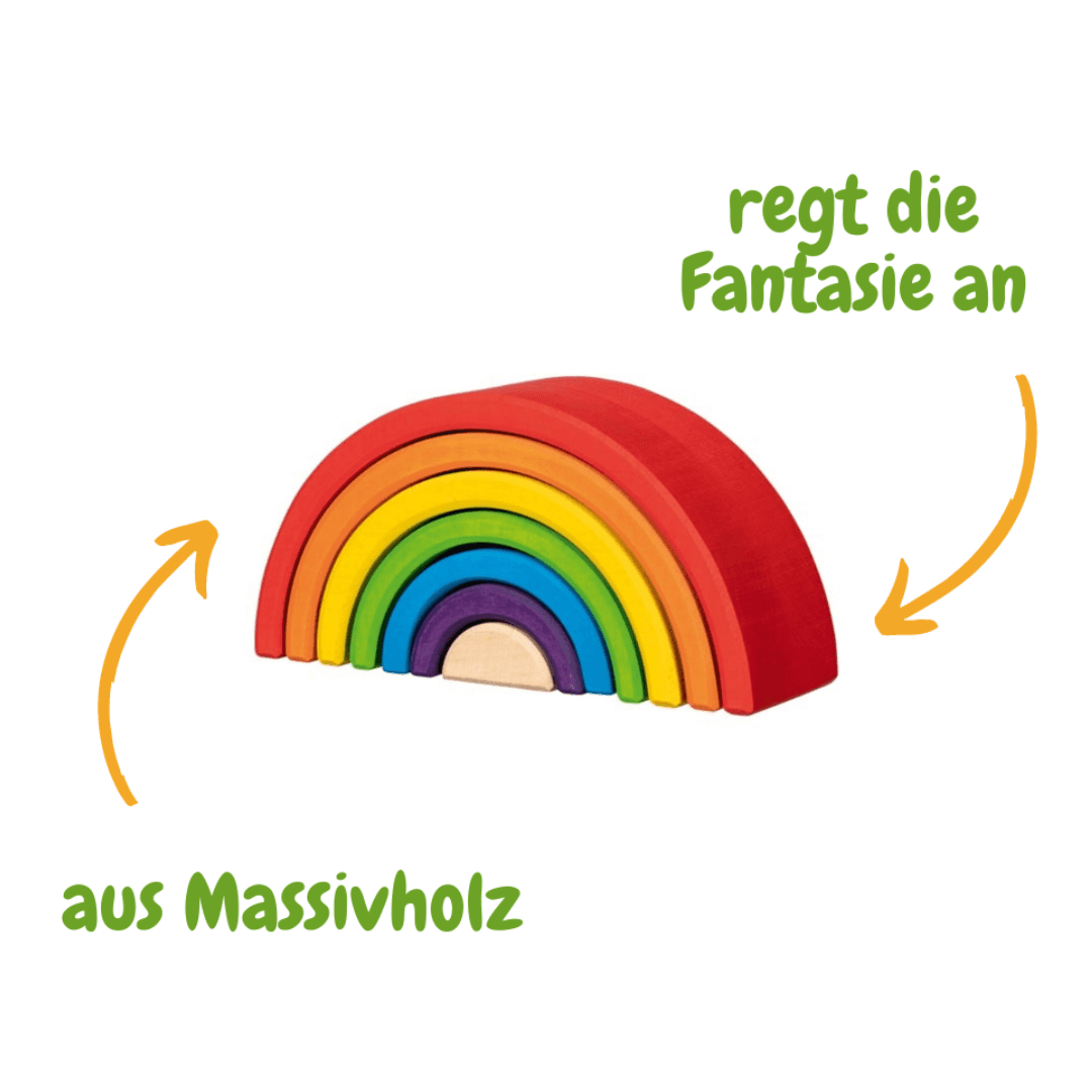 - Förderung der motorischen Fähigkeiten: Beim Spielen mit dem Regenbogen werden die motorischen Fähigkeiten deines Kindes gefördert. Es kann die verschiedenen Teile greifen, stapeln und balancieren, was seine Hand-Auge-Koordination und Feinmotorik schult. Gleichzeitig lernt es, Formen und Größen zu unterscheiden und erste physikalische Prinzipien zu entdecken.