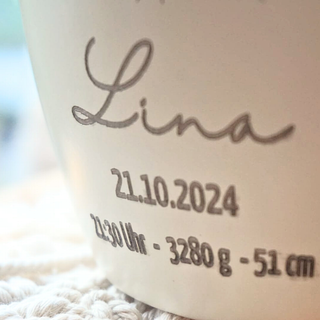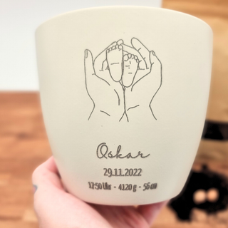 Hinweis: Die Farbe der Gravur kann je nach Beschaffenheit des Tons leicht variieren – von hellgrau bis anthrazit. Sie entsteht durch den Laserprozess selbst, ganz ohne zusätzliche Farbe, und macht jeden Topf zu einem echten Unikat.